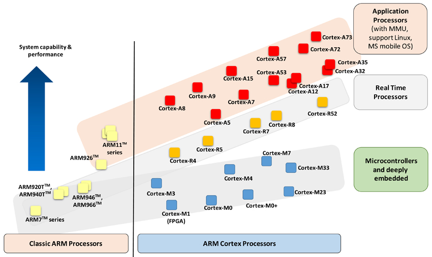 ARM 제품군은 (회사 이름인 ARM을 이용하여) 아래 3가지로 나눈다.