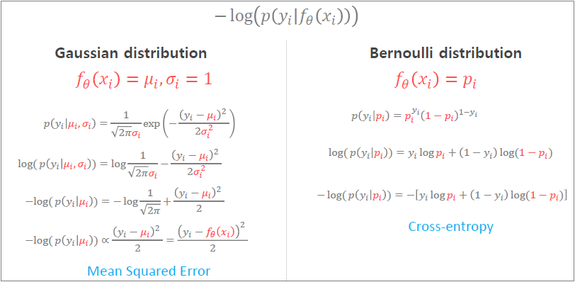 결론 : 로스 함수로 MSE(Mean Square Error)를 쓰는 이유는 네트워크 출력 값이 가우시안 분포를 따를 것으로 가정하기 때문이고, CE(Cross Entrophy Error)를 쓰는 이유는 네트워크 출력 값이 이항분포를 따를 것으로 가정하기 때문이다.