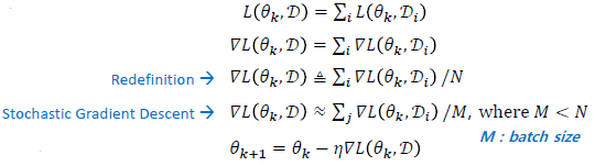 한번 업데이트 할때, 모든 데이터를 다 사용하긴 어려우으로 Batch(M) 단위로 데이터의 로스를 구해서 학습 시킨다.