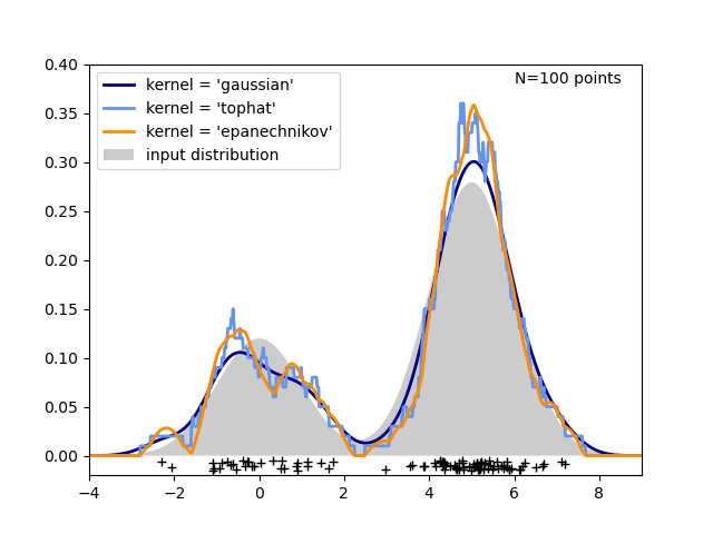Kernel density estimation in scikit-learn is implemented in the KernelDensity estimator, which uses the Ball Tree or KD Tree for efficient queries (see Nearest Neighbors for a discussion of these). Though the above example uses a 1D data set for simplicity, kernel density estimation can be performed in any number of dimensions, though in practice the curse of dimensionality causes its performance to degrade in high dimensions.