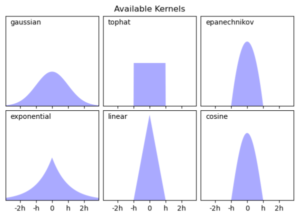 Mathematically, a kernel is a positive function K(x;h) which is controlled by the bandwidth parameter h. Given this kernel form, the density estimate at a point y within a group of points xi;i=1⋯N is given by:
